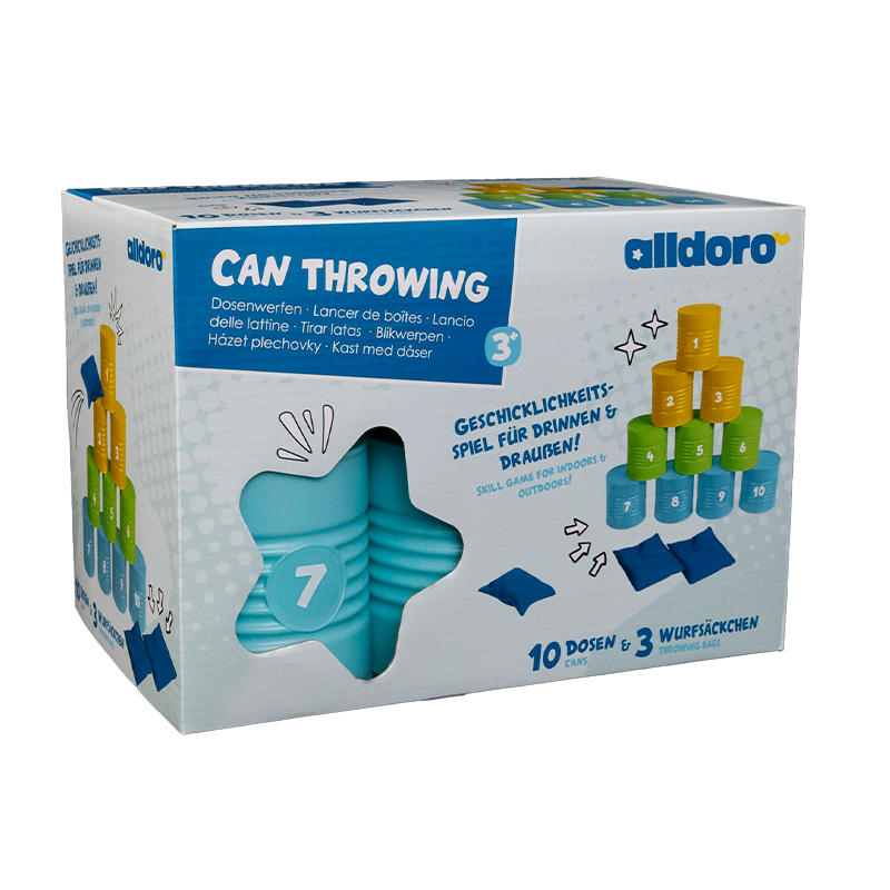 Tyto barevná hra s házením plechovek od námi ověřené německé značky Alldoro přináší klasickou pohybovou zábavu přímo k vám domů! S 10 barevnými očíslovanými plechovkami a 3 praktickými házecími pytli můžete proměnit jakýkoli prostor v mini pouť. Tato oblíbená hra s házením plechovek pro děti zaručí hodiny zábavy – ať už v dětském pokoji, na zahradě nebo na narozeninové oslavě. Stačí jeden hod a zábavná soutěž o nejlepší počet zásahů začíná.