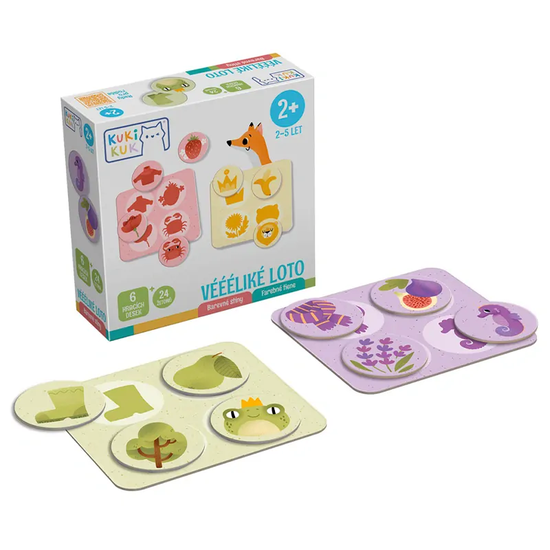 Loto Barevné stíny je zábavná hra, která pomáhá dětem procvičovat jejich schopnost poznávat tvary a barvy. Různé herní varianty. 24 velkých kulatých žetonů, 6 hracích desek kvalitního kartonu. Vyrobeno v ČR.