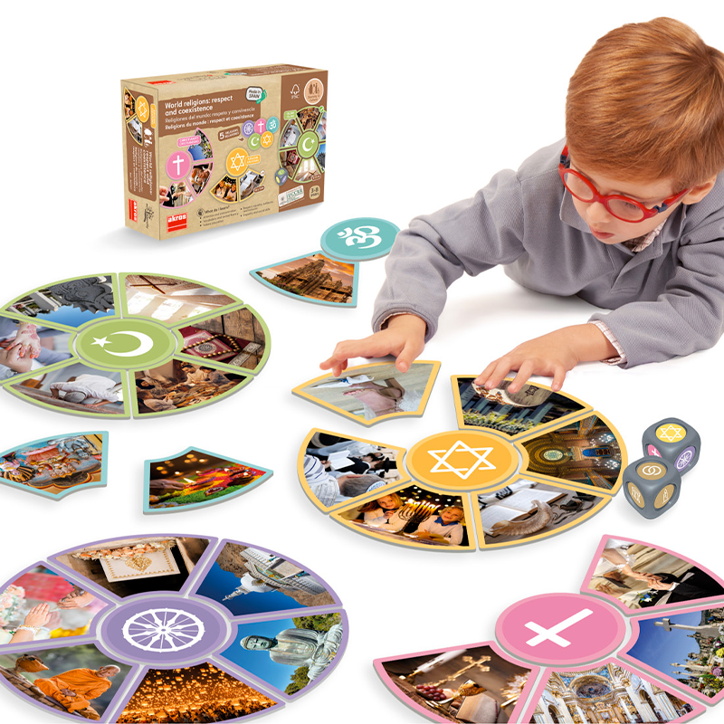 Asociační hra s fotografiemi k objevování a poznávání různých náboženství. Nabízí možnost rozvíjet hodnotovou výchovu jako základ pro řešení konfliktů. Pomáhá vám prosazovat kulturu míru a respektu již od útlého věku. Hra obsahuje následující náboženství: buddhismus, křesťanství, hinduismus, islám a judaismus. Hoďte kostkou a zjistěte o nich vše!