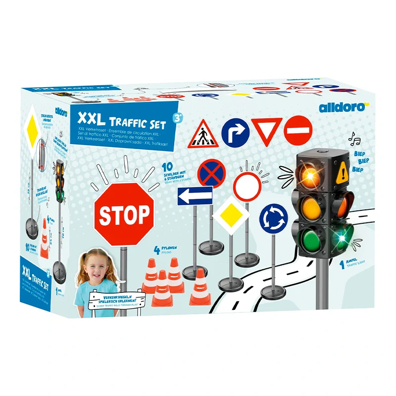 S touto velkou dopravní sadou od námi ověřené německé značky Alldoro si můžete hravou formou procvičit a naučit se správné chování v provozu. Obrovská XXL sada obsahuje bateriový semafor, 10 běžných pouličních značek se 6 stojany a 4 pylony.
